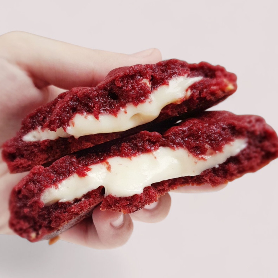 Cookie red velvet, macio, leve toque de cacau 100%, gotas de chocolate branco nobre e recheado com brigadeiro cremoso de Leite Ninho. Peso aprox: 100g