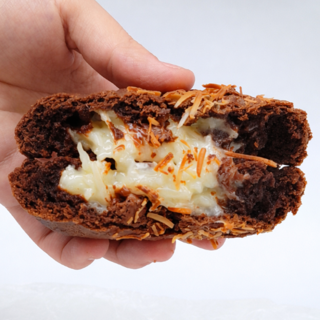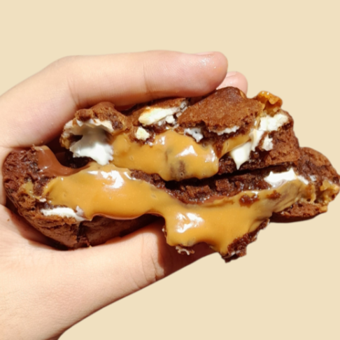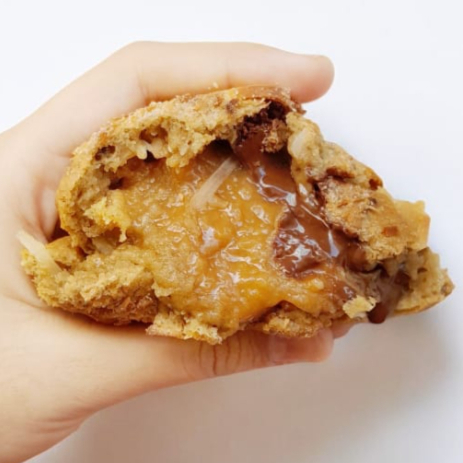 Cookie amanteigado, massa de baunilha com um toque de flocos de coco, gotas de chocolate nobre e recheado com uma cocada caramelizada, morena e muito cremosa. Peso aprox: 100g.