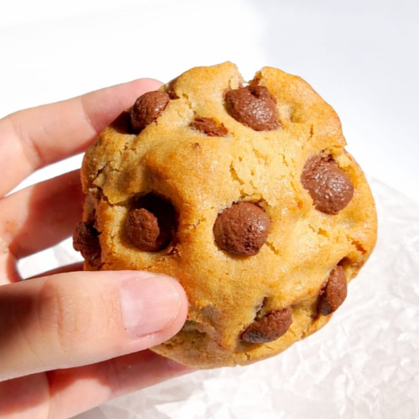 Cookie amanteigado, úmido por dentro e crocante por fora, com pedaços de chocolate meio amargo que se derretem em cada mordida. Peso aprox: 100g.