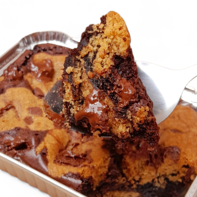 Combinação de brownie + cookie, formando um delicioso brookie! cookie tradicional com pedaços de chocolate meio amargo, e um brownie úmido com casquinha levemente crocante. Assado na MINI marmita 220ml, Peso aprox: 180g.