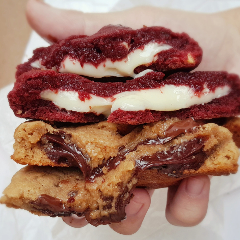 Duo com os dois cookies mais queridos: Red velvet recheado com brigadeiro de Leite Ninho e o Tradicional amanteigado recheado com Nutella pura e cremosa. PESO UNIDADE: 100g.