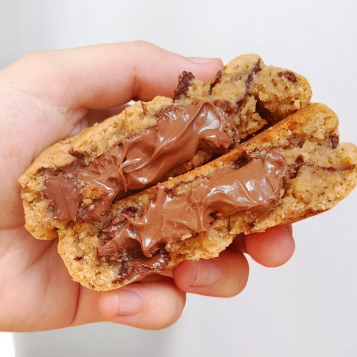 Cookie massa tradicional amanteigada, com gotas de chocolate nobre e recheio de Nutella pura. Peso aprox: 100g.