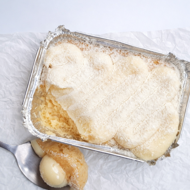 Massa branca fofinha, bem molhada no leite de coco, recheada com brigadeiro de coco cremoso e finalizada com coco em flocos. Feito na Mini marmita 220ml, Peso aprox: 240g