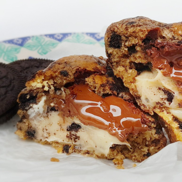 Cookie massa tradicional, com pedaços de oreos e gotas de chocolate meio amargo, recheado com brigadeiro de Oreo ao toque leve de baunilha. Peso aprox: 100g.
