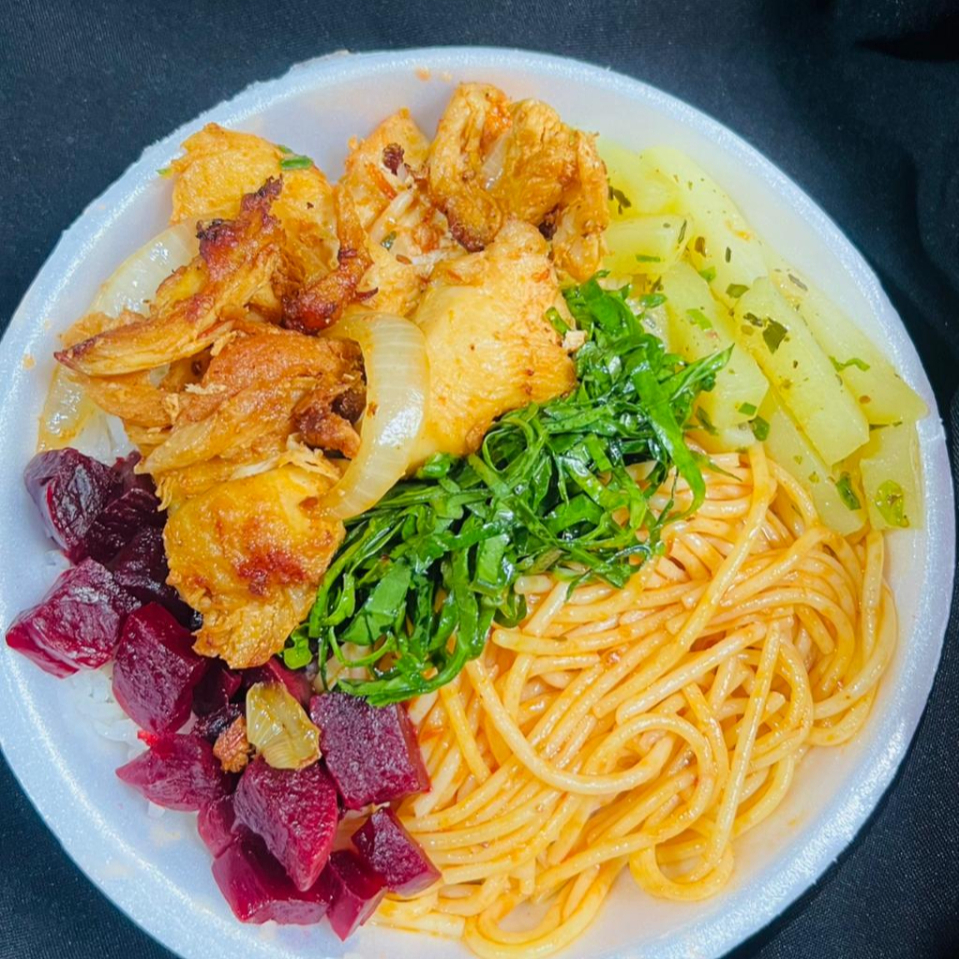 Guarnições: ARROZ BRANCO, FEIJÃO DE CALDO, SALADA FRESCA, MACARRÃO ESPAGUETE, FAROFA DA CASA, CARNE BOVINA COM FRANGO OU LINGUIÇA