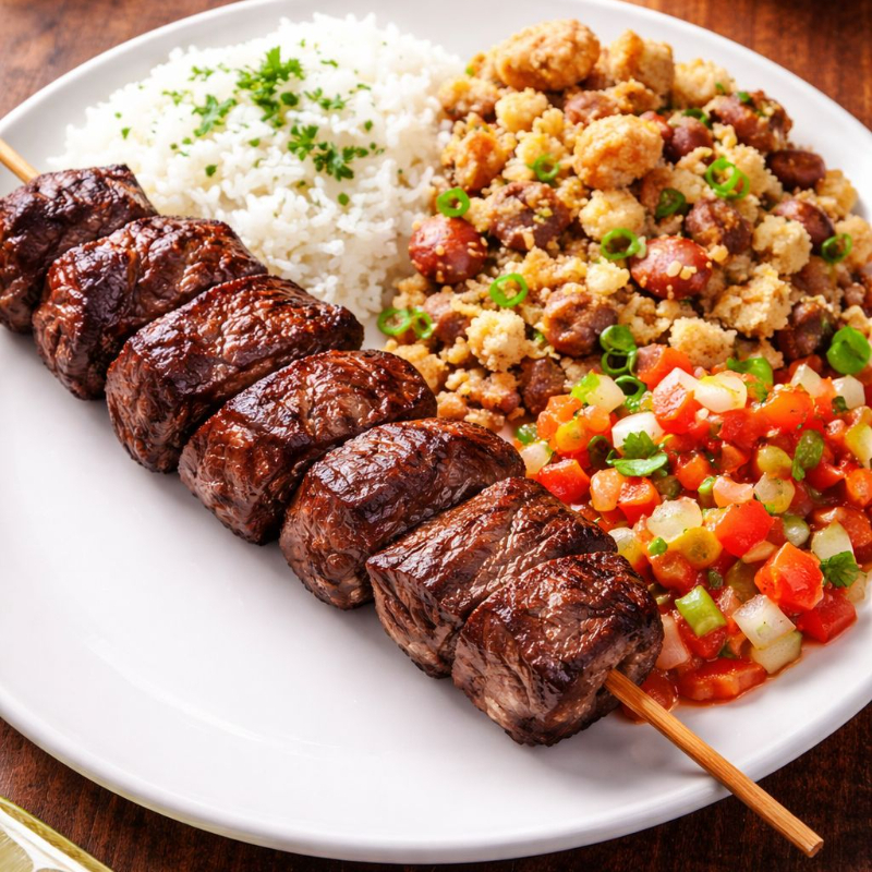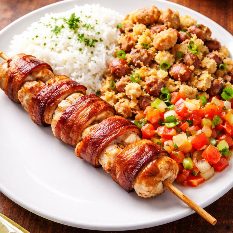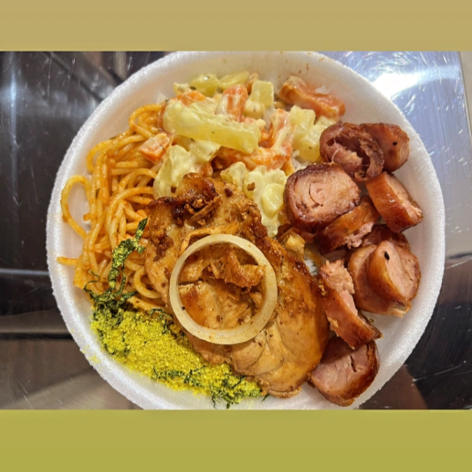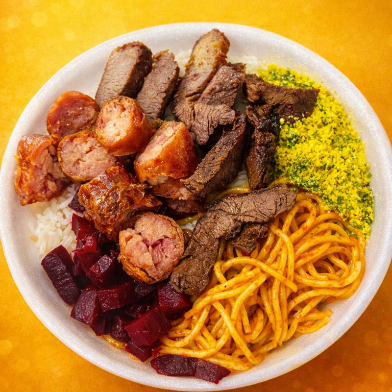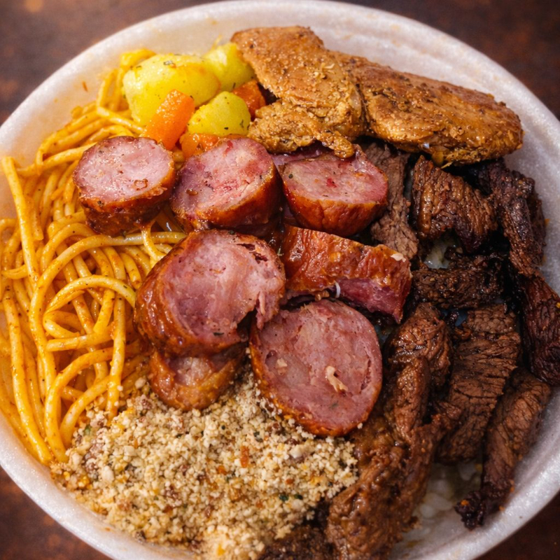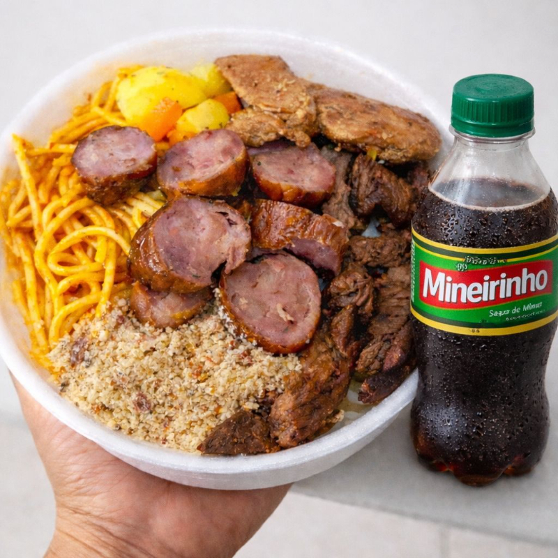**Marmita Premium: Churrasco com Linguiça e Acompanhamentos Clássicos** Delicie-se com uma marmita farta e irresistível, perfeita para quem ama um bom churrasco! - **Contra Filé no Ponto**: Cortes suculentos e bem temperados, grelhados no ponto certo para manter o sabor e a maciez. - **Linguiça Assada**: Juicy e levemente defumada, com aquele tempero tradicional que combina