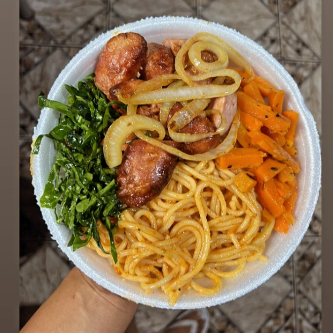 1 Marmitex com uma porção generosa de macarrão