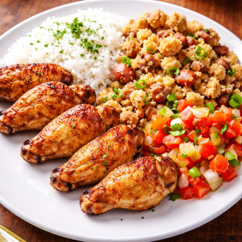 Guarnições: Arroz branco soltinho de mamãe, feijão de caldo cremoso, legumes cozidos, macarrão espaguete, farofinha caseira, couve refogada