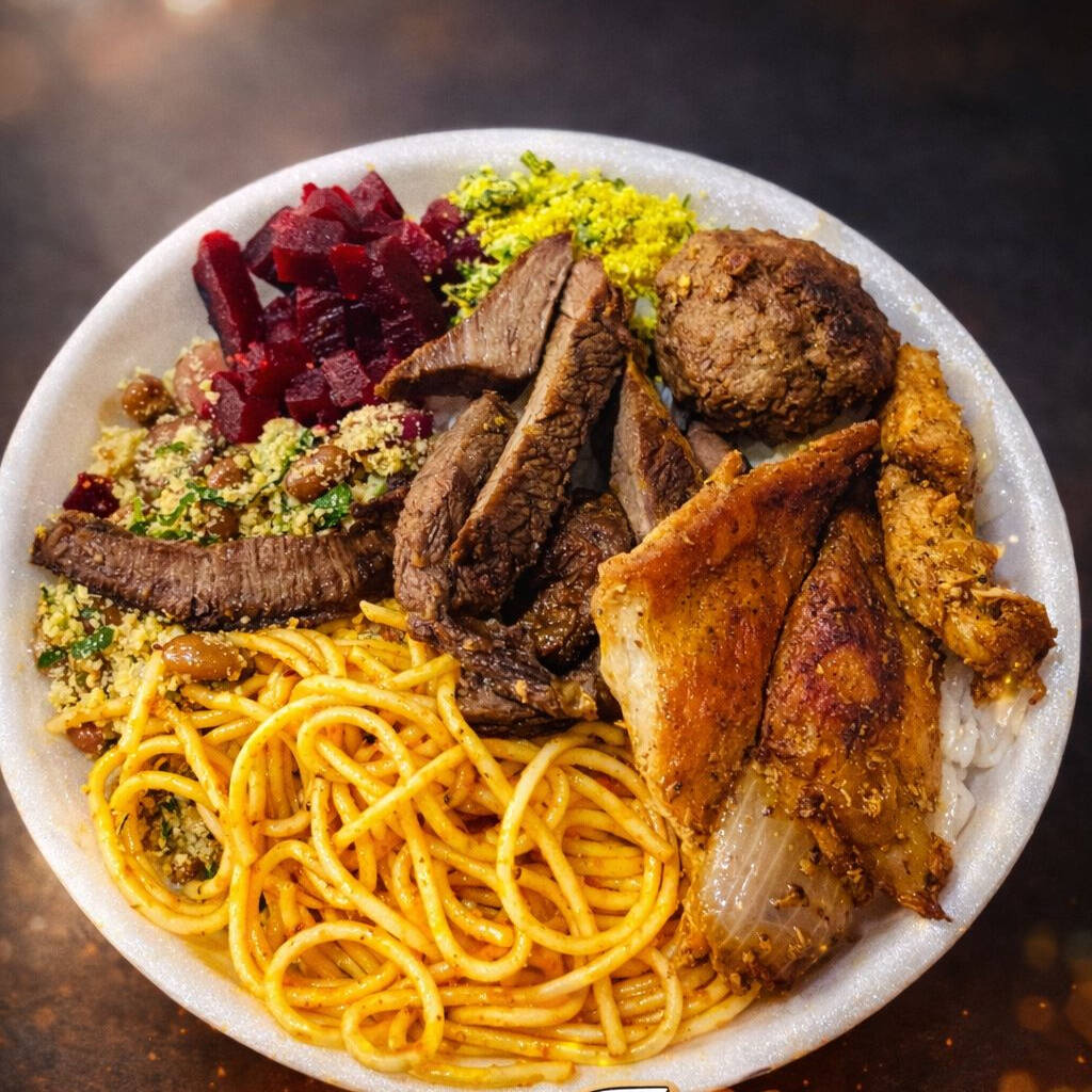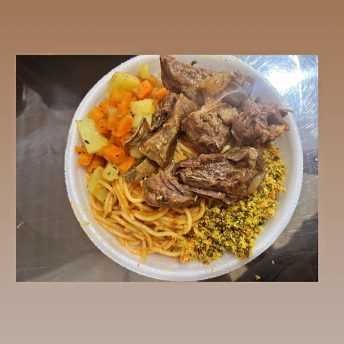 Guarnições: arroz branco, feijão de caldo cremoso, legumes, macarrão espaguete e a carne delíciosa