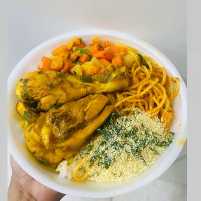 Acompanha arroz branco soltinho, feijão de caldo cremoso, legumes cozidos, salada fresca, macarrão espaguete ao molho, farofa crocante e salada