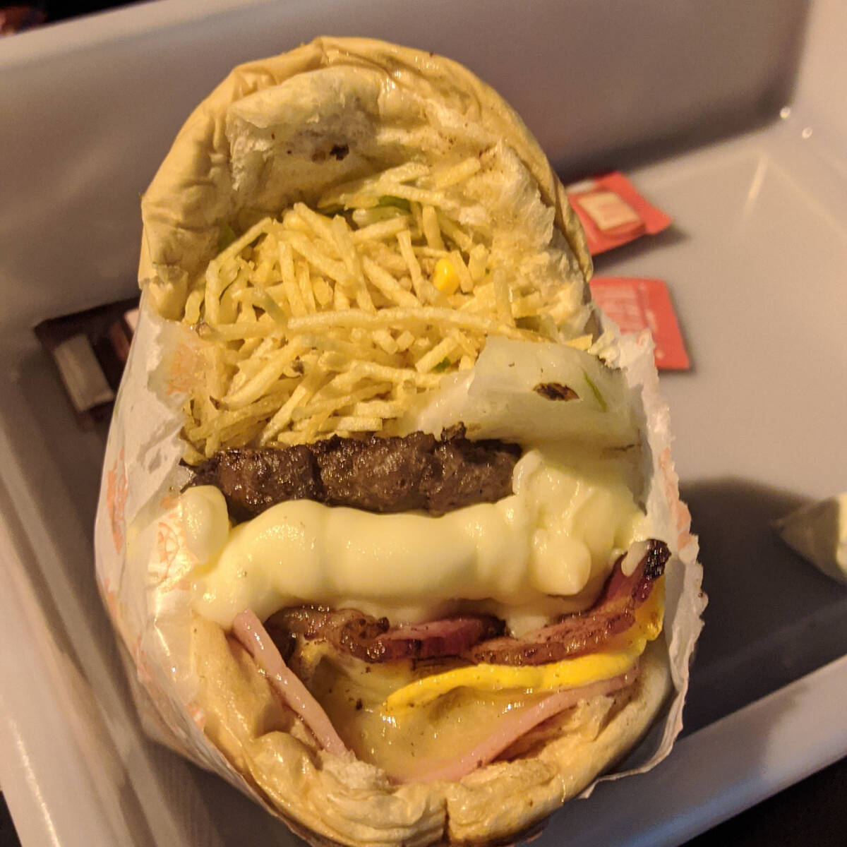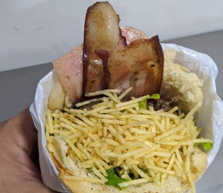 Pão, carne, bacon, ovo, mussarela, presunto, alface, milho e batata palha