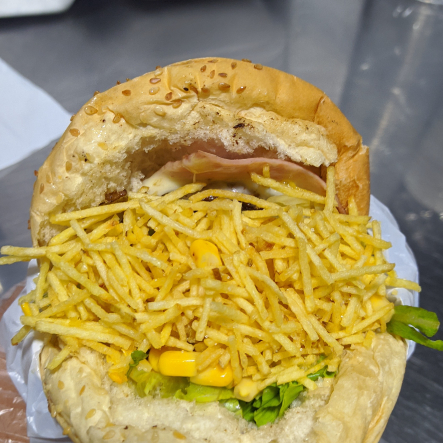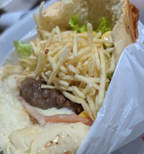 Pão, carne, ovo, mussarela, presunto, alface, milho e batata palha
