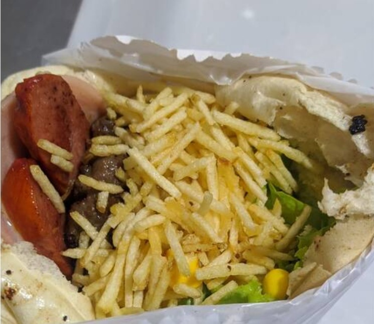 Pão , carne, salsicha, ovo, mussarela, presunto, alface, milho e batata palha
