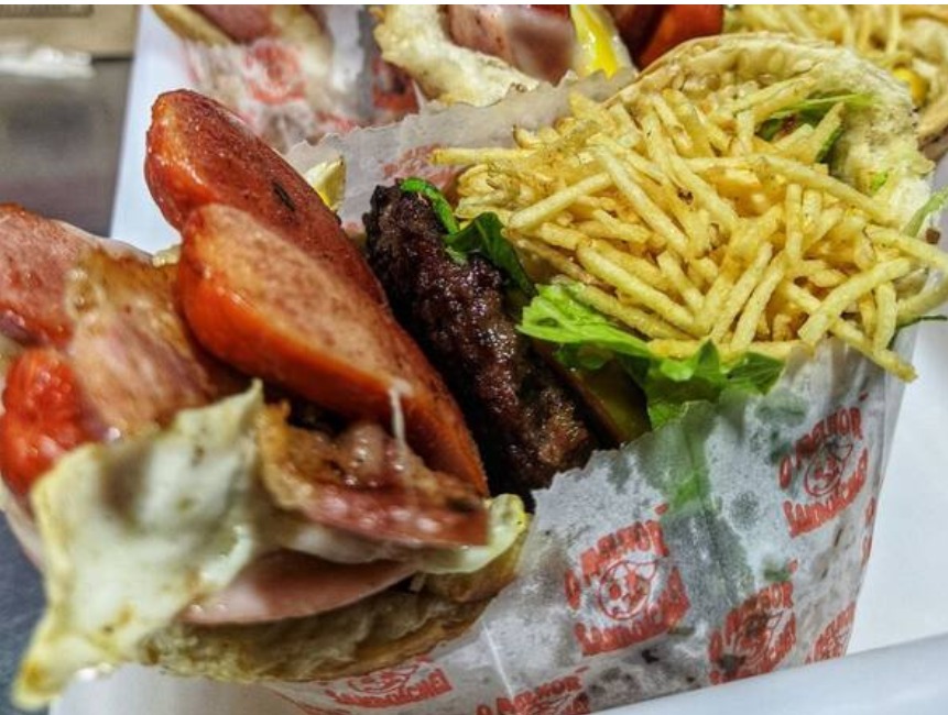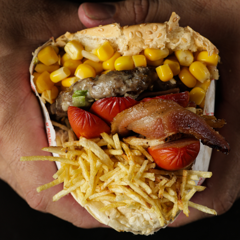 Pão, hamburguer, salsicha, bacon, ovo, presunto, mussarela, alface, milho e batata palha