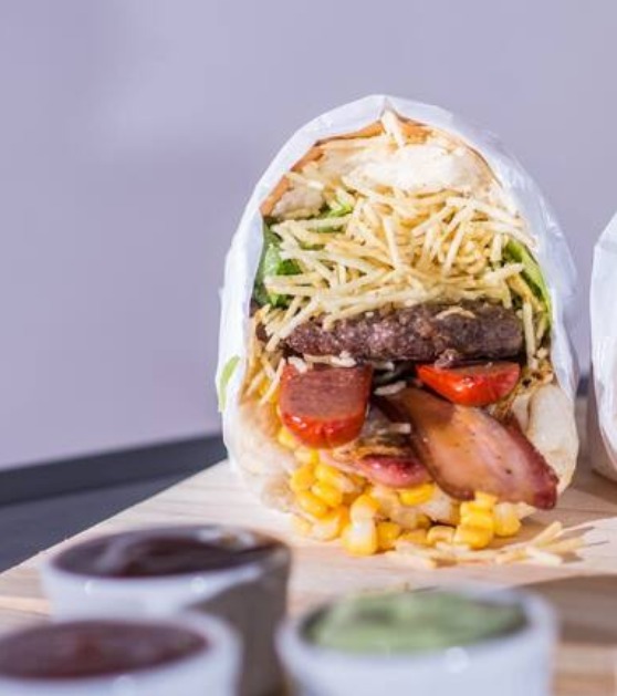 Pão, carne, salsicha, mussarela, presunto, alface, milho e batata palha