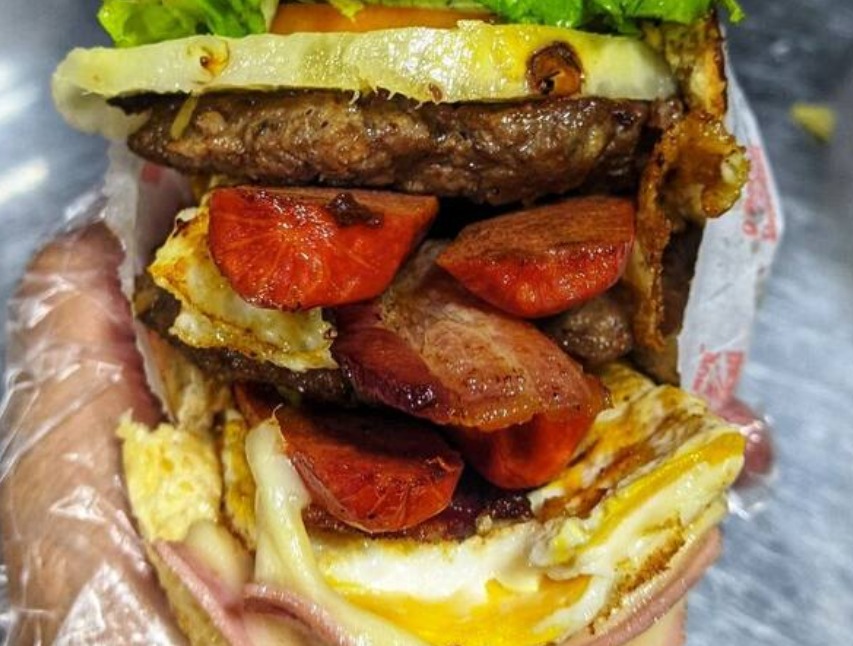 Pão, 2 hambúrguer, 2 salsicha, 2 ovo, 2 bacon, 2 mussarela, 2 presunto, alface, milho e batata palha
