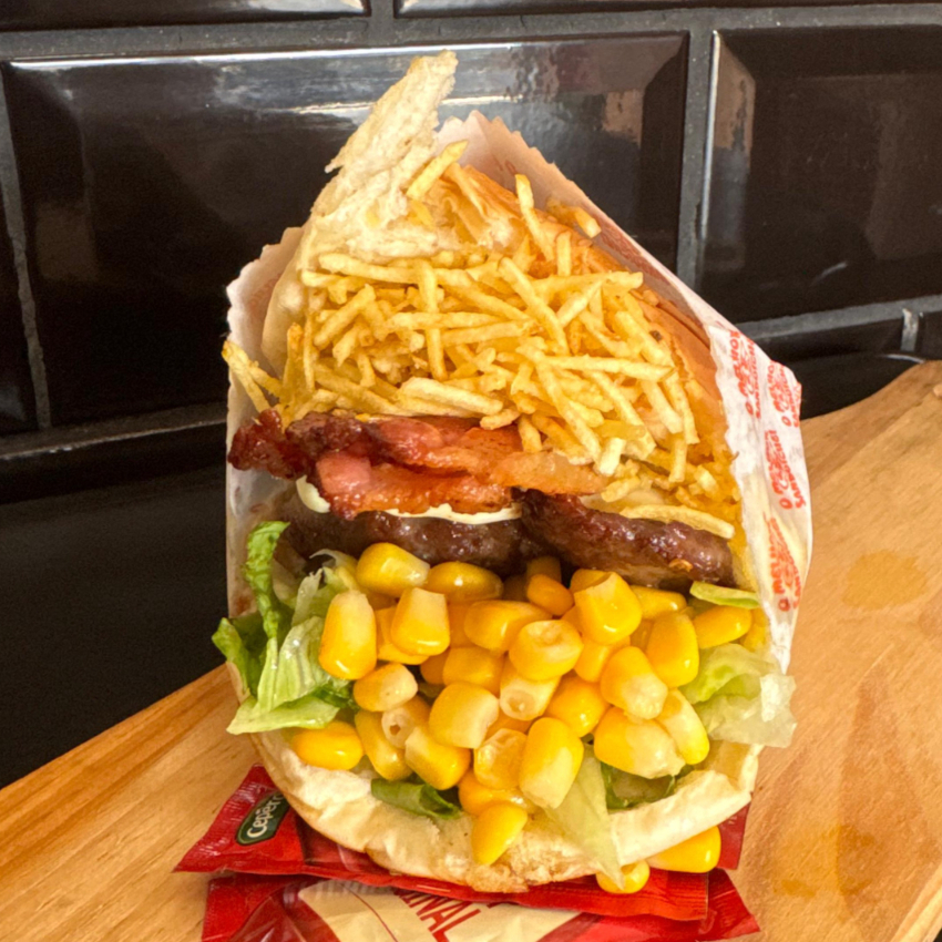 Pão , 2 hambúrguer, 2 bacons, 2 mussarelas, 2 presunto, catupiry, alface, milho e batata palha