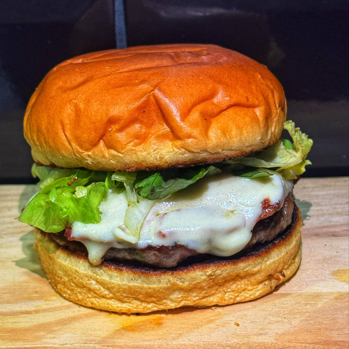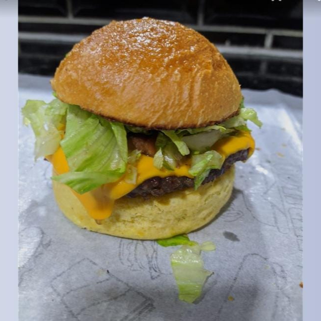 Pão brioche, 2 hamburguer, bacon picado, 2 muçarela, alface americana e maionese da casa
