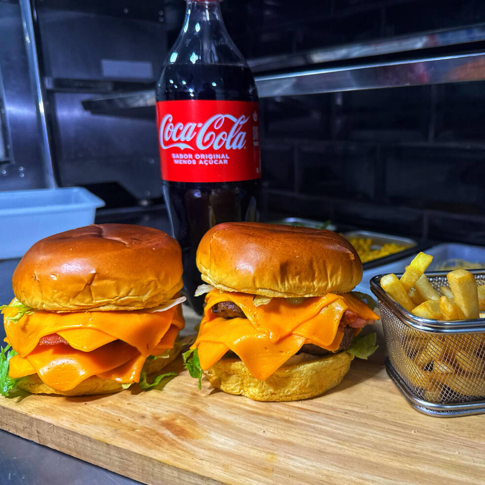Nosso delicioso double acompanha , pão brioche, 2 hambúrguer 100g , 4 cheddar, bacon, picado , alface, americana, e molho especial