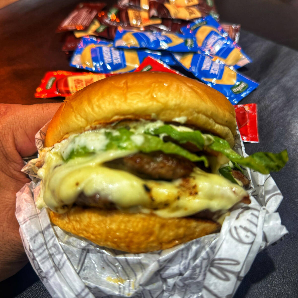 Pão brioche, 3 hamburguer, bacon picado, muçarela, alface americana e maionese da casa