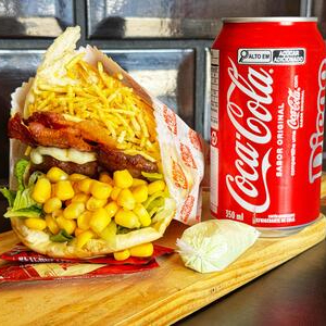 X-Tudo (Pão, Hamburger, 2 salsichas, ovo, bacon, presunto, Mussarela, alface, milho e batata palha) + Refri 220 ml