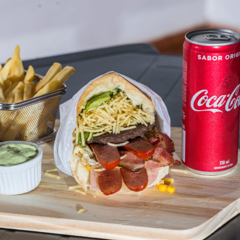 Tudão de Hamburguer ( Pão, hamburguer, 2 salsichas, bacon, ovo, presunto, mussarela, alface, milho e batata palha), Batata frita 200g e coca lata 350ml