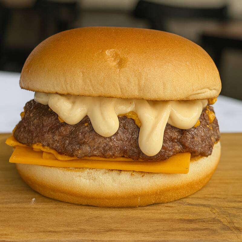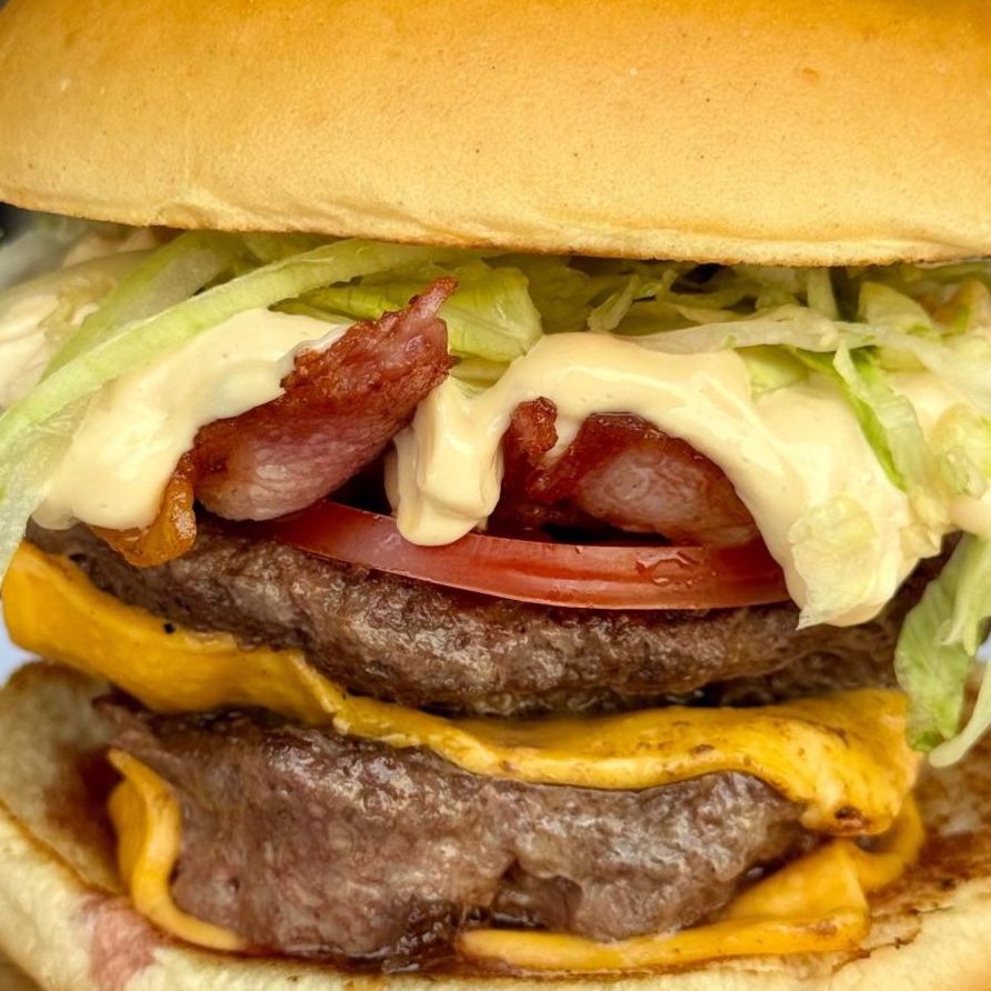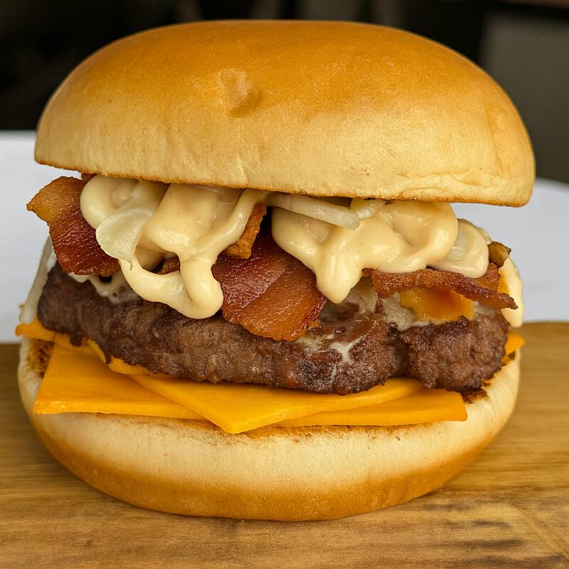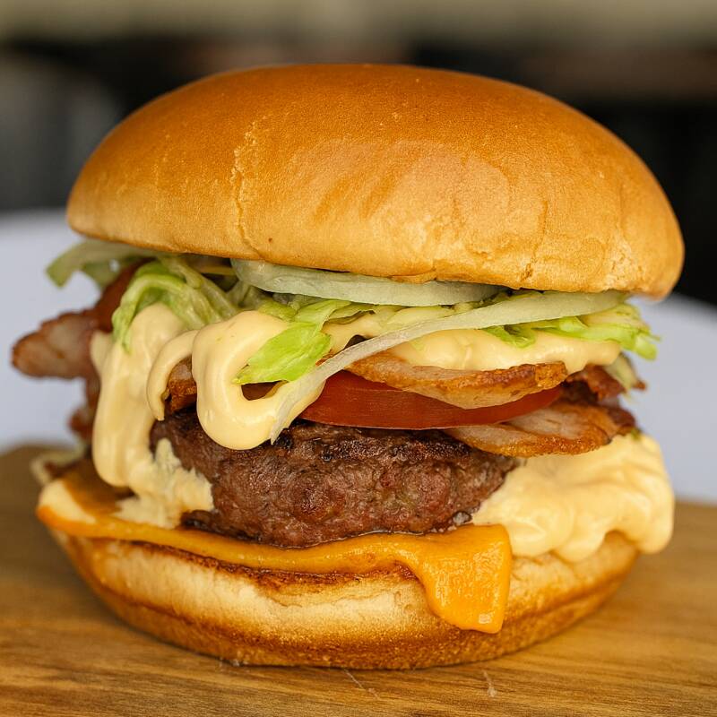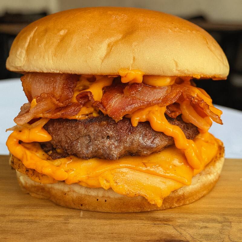Pão, hamburguer, duplo cheddar, duplo bacon, molho tradicional, cebola crua;