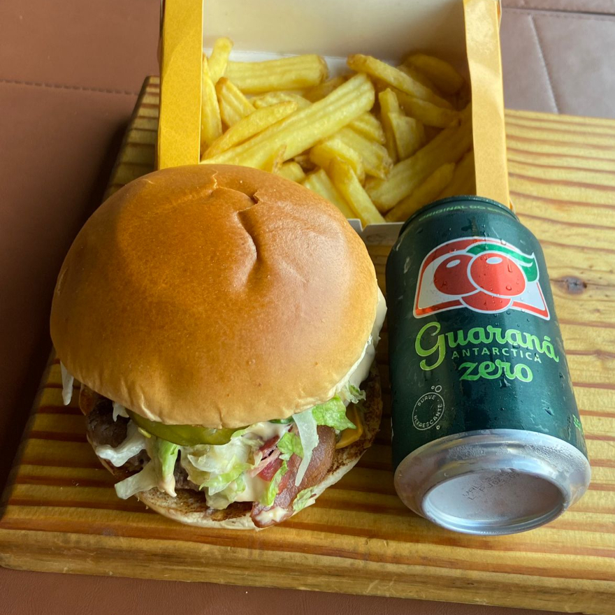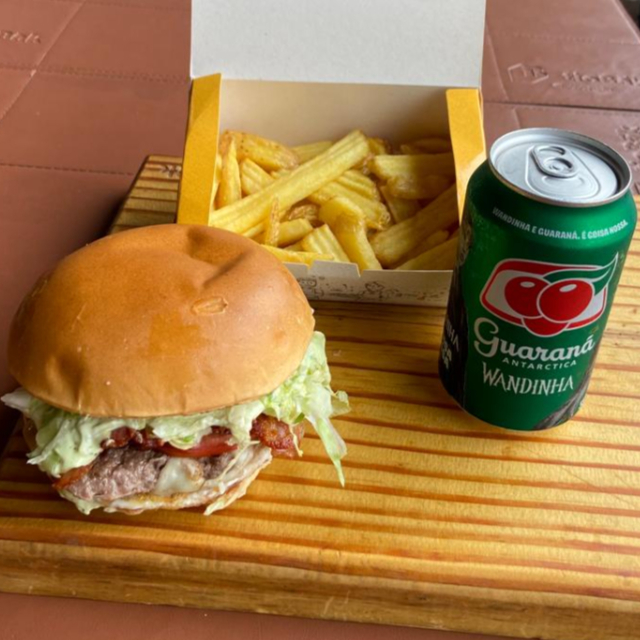 Pão, hamburguer, mussarela, ovo, tomate, maionese verde, alface americana, cebola crua, + batata frita 150g, + guarana lata 350ml