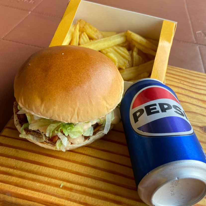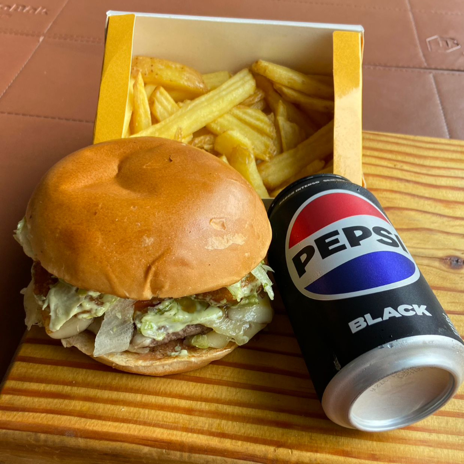 Pão, hamburguer 110g, mussarela, melado de cana, queijo coalho, tomate, maionese verde, alface americana e 2 aneis de cebola, + batata frita 150g, pepsi black lata 350ml