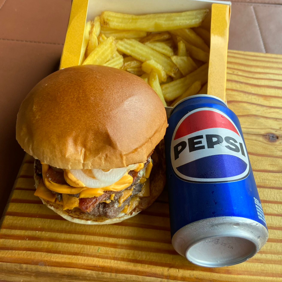 Pão, 2 hamburguer de 110g, triplo cheddar, molho picante, duplo bacon, cebola crua, + batata frita 150g, + pepsi lata 350ml
