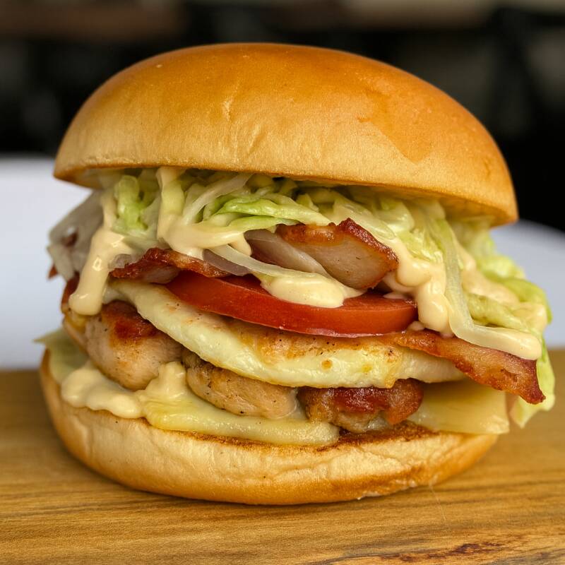 Pão, file de frango grelhado, tomate, bacon, molho rose, alface americana e cebola;