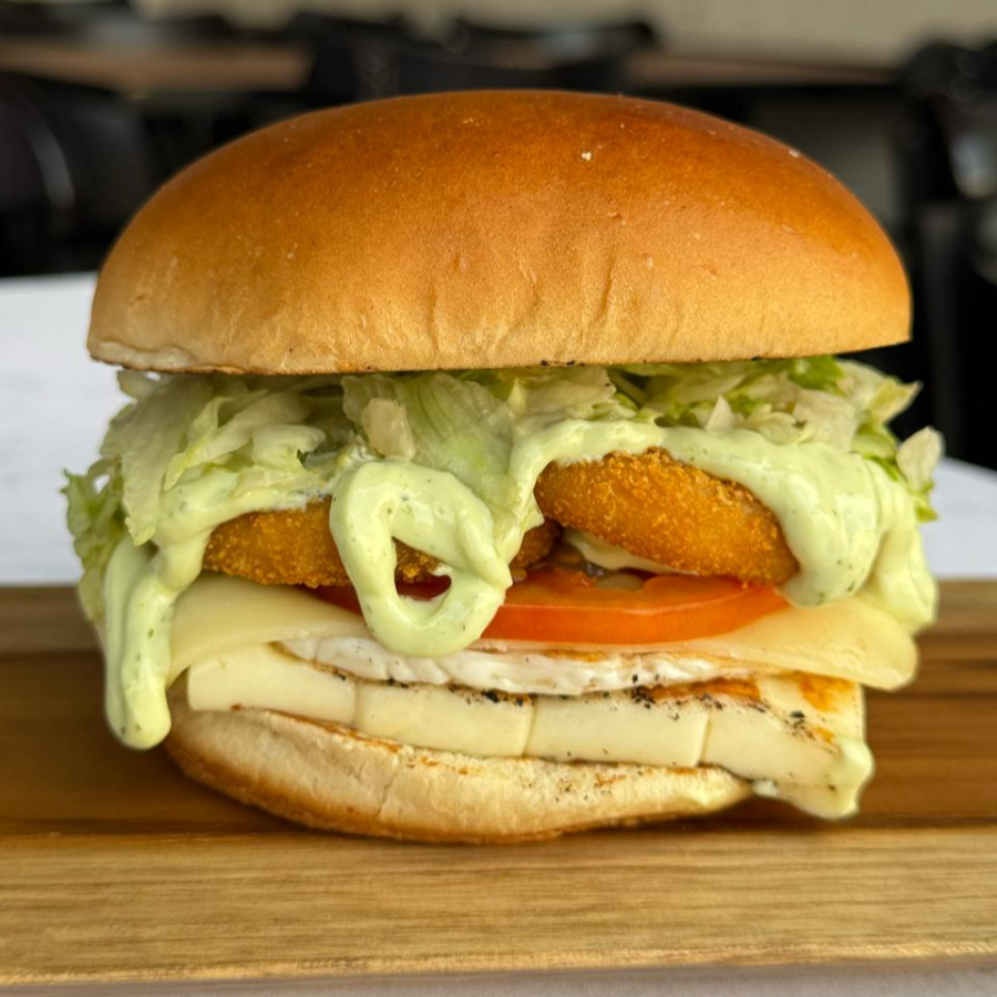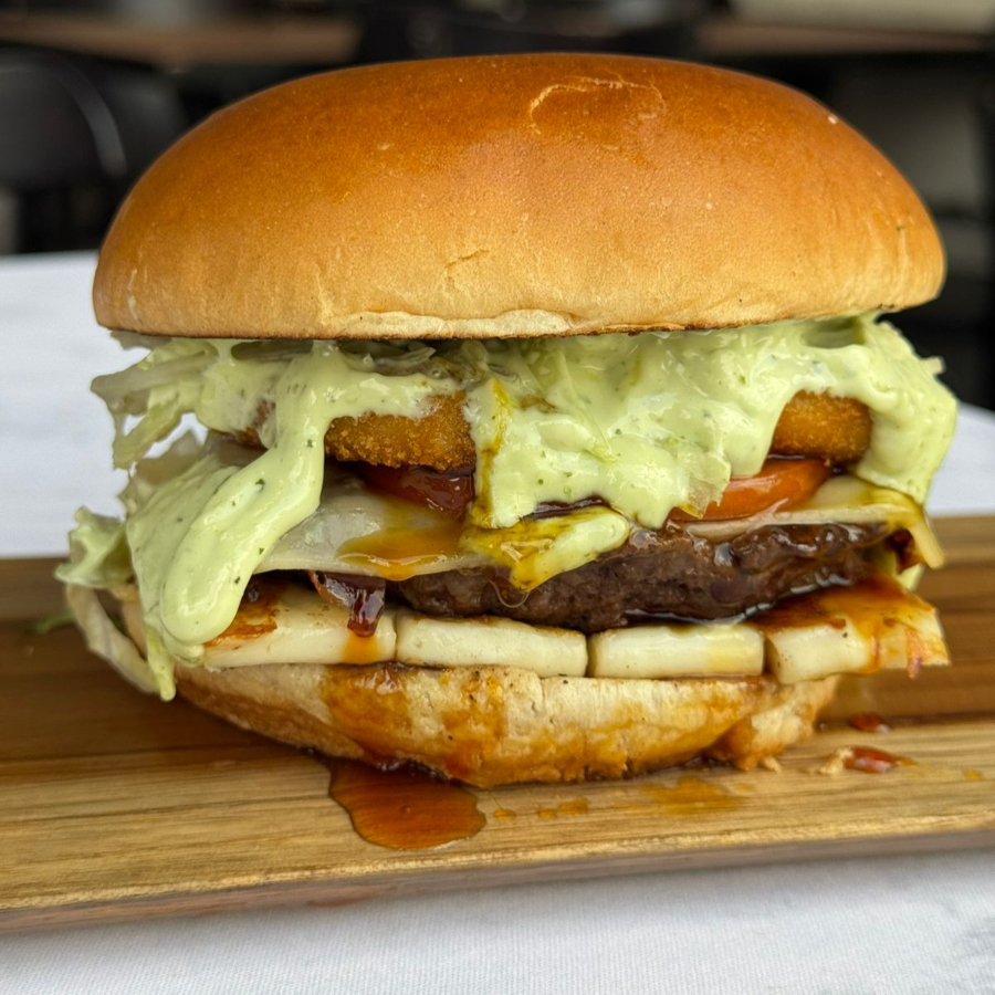 Pão, hamburguer 110g, mussarela, melado de cana, queijo coalho, tomate, maionese verde, alface americana e 2 aneis de cebola;