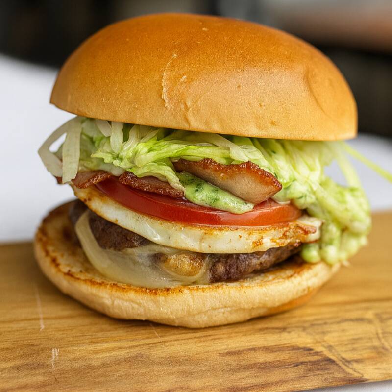 Pão, hamburguer, mussarela, ovo, tomate, maionese verde, alface americana, cebola crua;