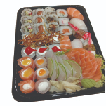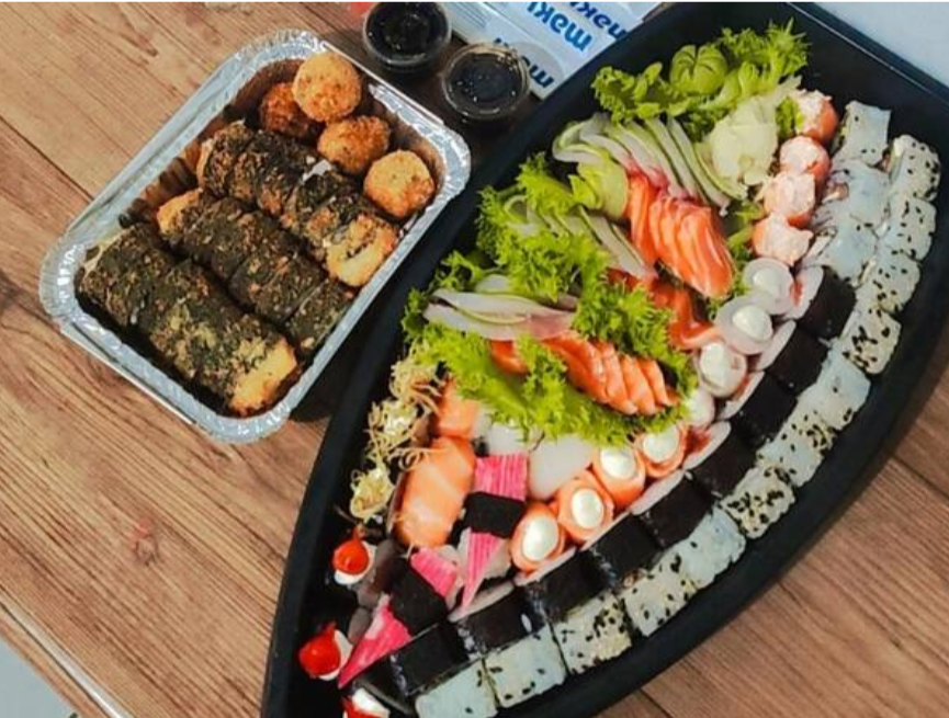 30 sushis variados, 12 gunkans, 6 niguiris, 15 salmão, 15 peixe branco, 12 hot rolls de salmão, 6 hot rolls de tilápia crocante, 4 croquetes de peixe Acompanha no pedido: 4 pares de hashi, 2 molhos teriaki e 2 molhos shoyo.
