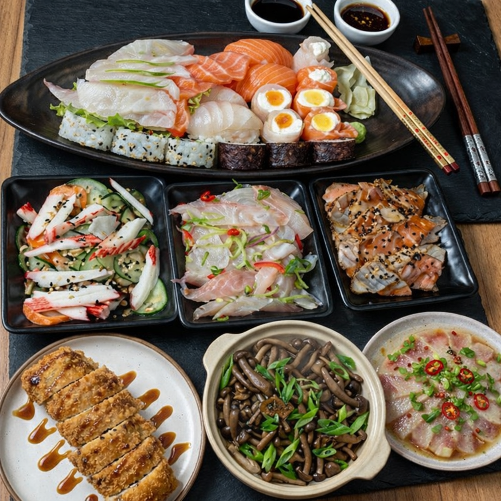 6 fatias de carpaccio de peixe branco, 6 sushis variados, 6 salmão, 6 tilapia, 100gr de tataki, 4 niguiris, 100gr de shimeji, 6 hots crocantes, 100gr de sunomono, 100gr de ceviche e 6 gukans variados. Acompanha no pedido: 2 pares de hashi, 1 molho teriaki e 1 molho shoyo.