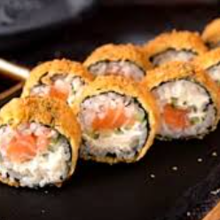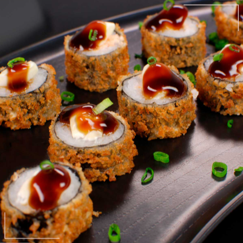Hot Philadelphia, algas marinha, arroz, salmão e cream cheese. Acompanha: 1 molho teriaki e 1 hashi