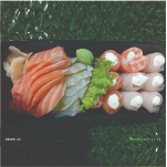 5 salmão, 5 tilápia, 5 peças de salmão maçaricado e 5 gunkan de salmão. Acompanha no pedido: 1 par de hashi e 1 molho shoyo.