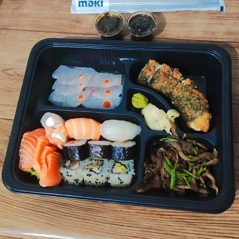 9 Sushis variados, 5 sashimis de salmão, 5 sashimis de tilápia, 4 niguiri variados, 6 gunkan variados,1 gukan do chef e 6 hot.
