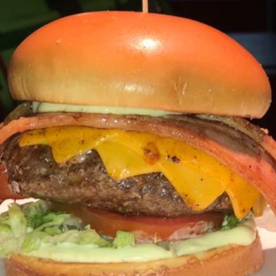 Pão brioche, hambúrguer artesanal 200g grelhado no fogo como churrasco, queijo cheddar, bacon, molho de ervas, salada de alface e tomate frescos.