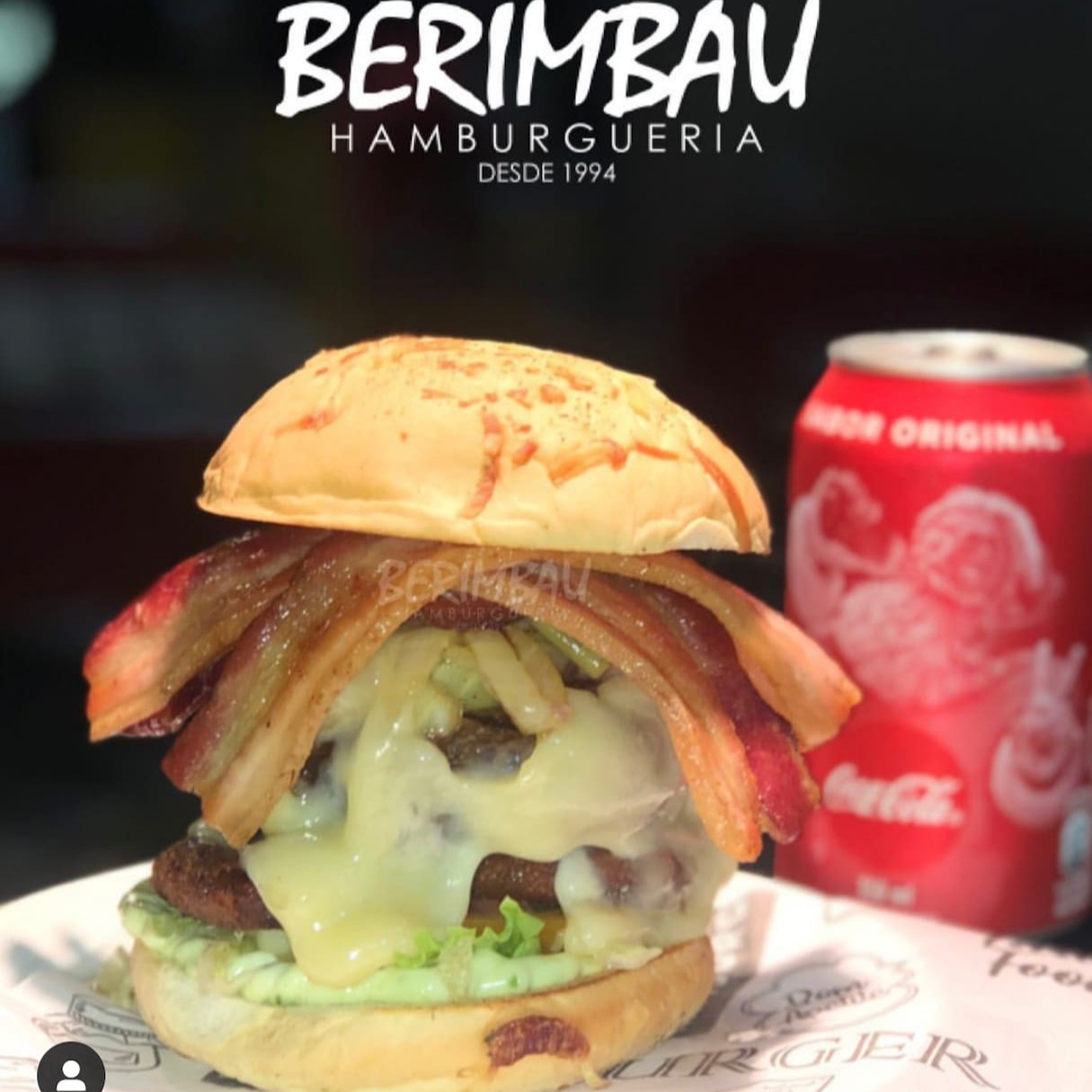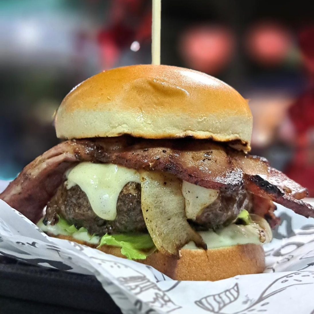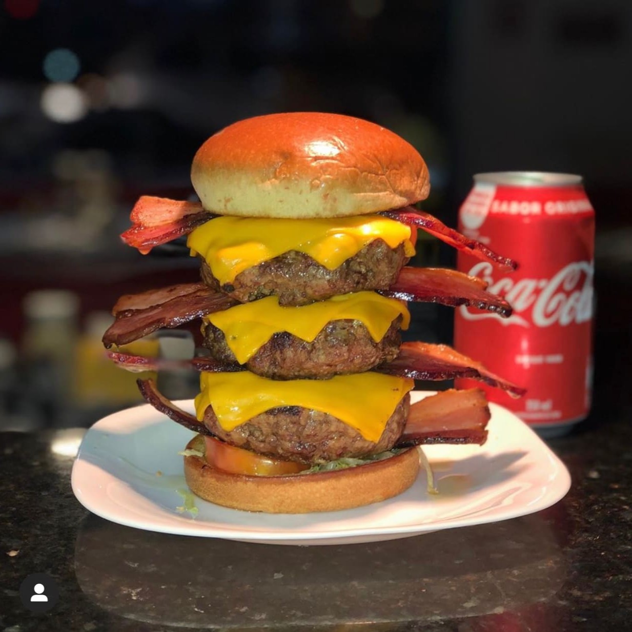 Pão brioche, 3 hambúrgueres artesanais 200g cada grelhados no fogo como churrasco, queijo cheddar, bacon, molho de ervas, salada de alface e tomate fresco.