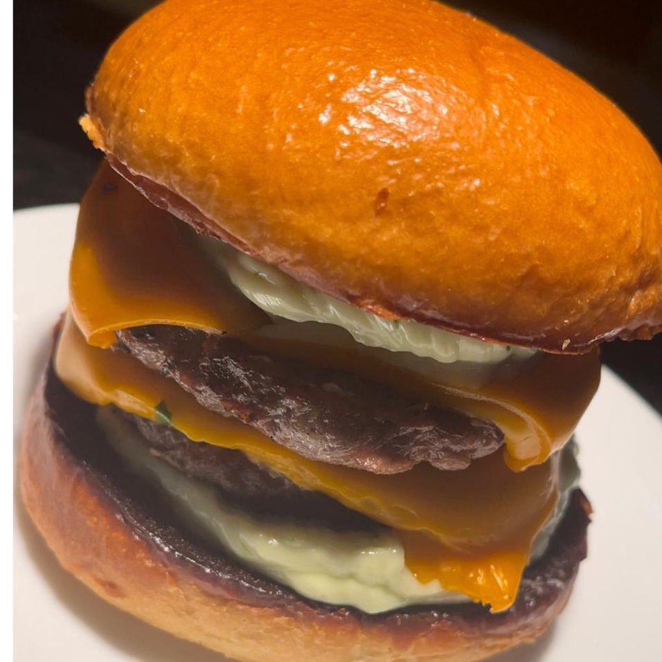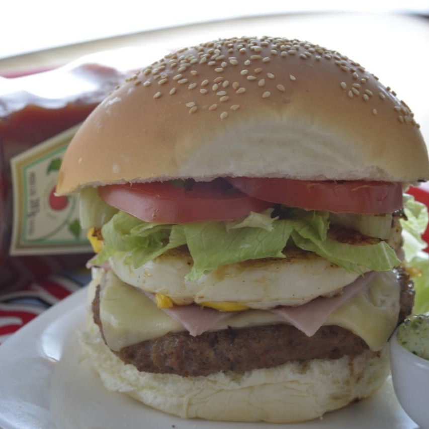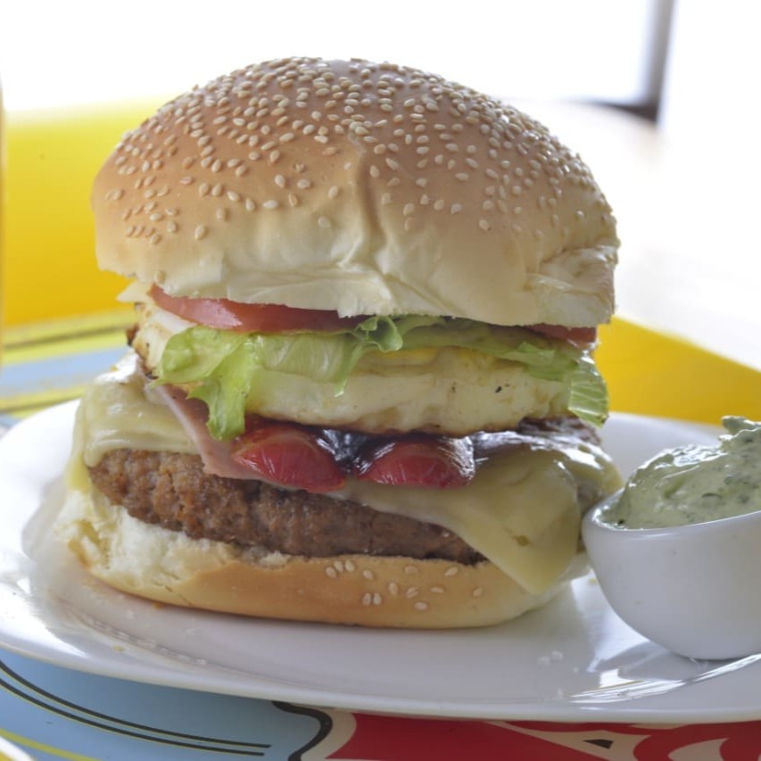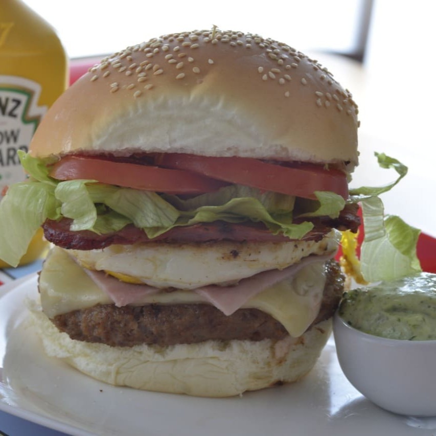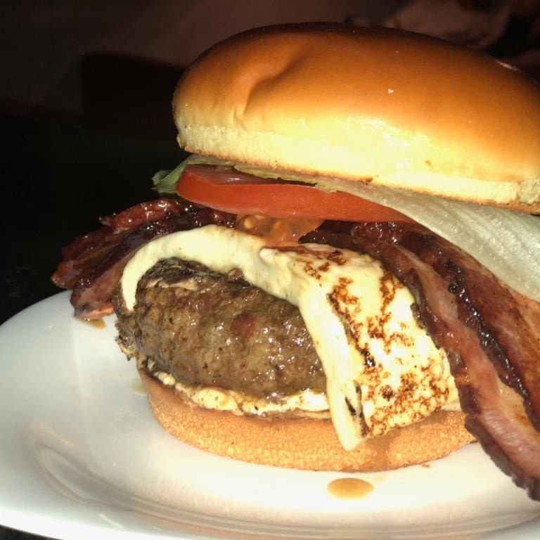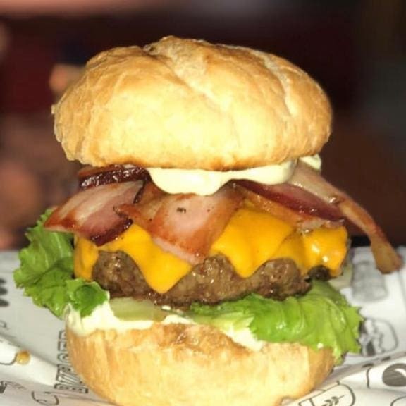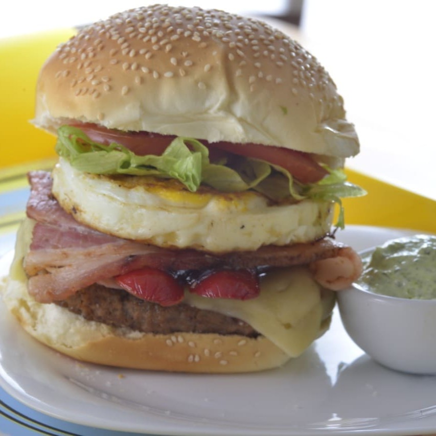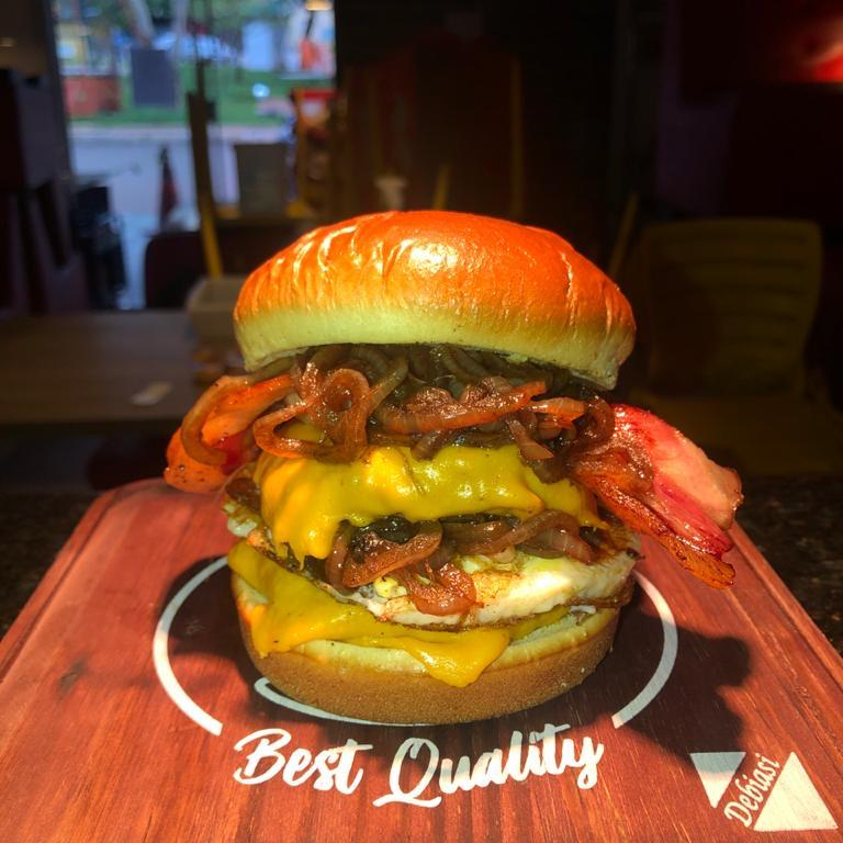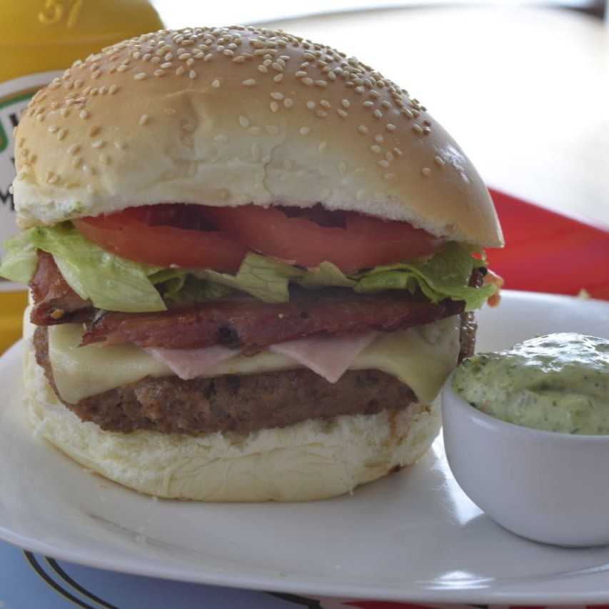 Pão com gergelim ,2 hambúrguers de fraldinha 120 gr cada,2 Chedar,bacon,ovo,molho especial e cebola