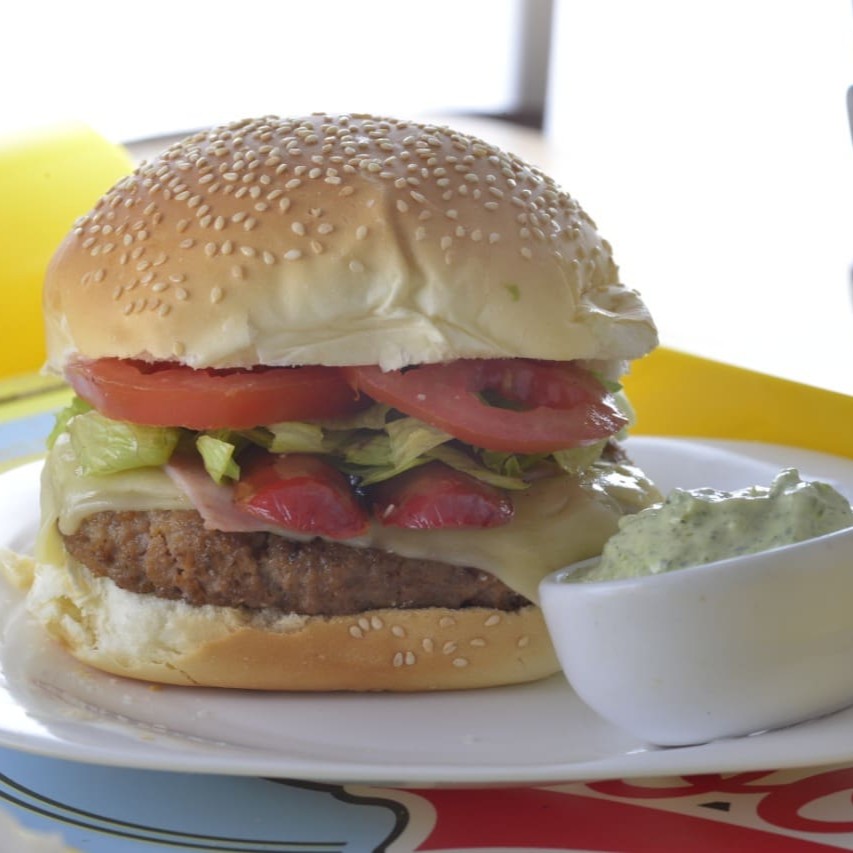 Pão brioche, filé de frango no grelhado fogo como churrasco, queijo cheddar, bacon, molho de ervas, salada de alface e tomate fresco.