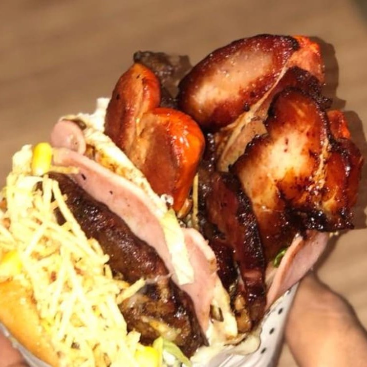 Pão, bacon, mussarela, presunto, salada, milho e batata.
