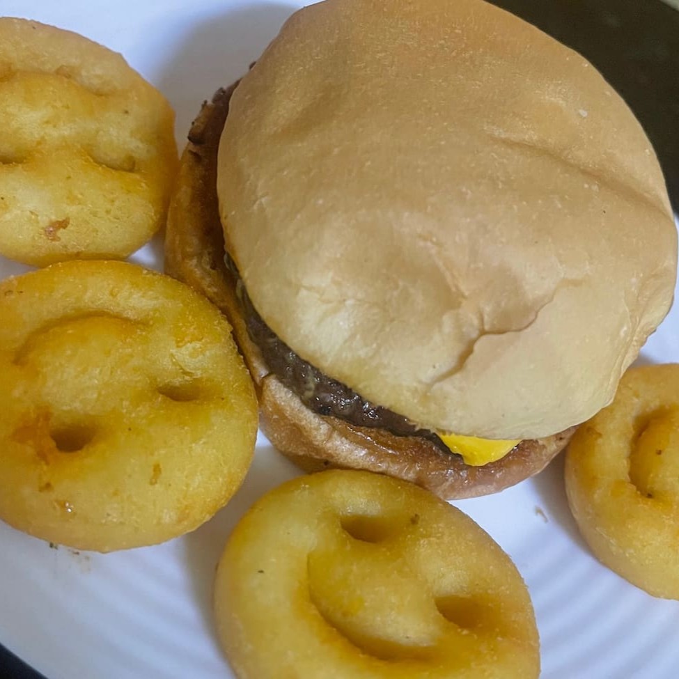 Pão, hambúrguer, cheddar e 4 batatas smile.
