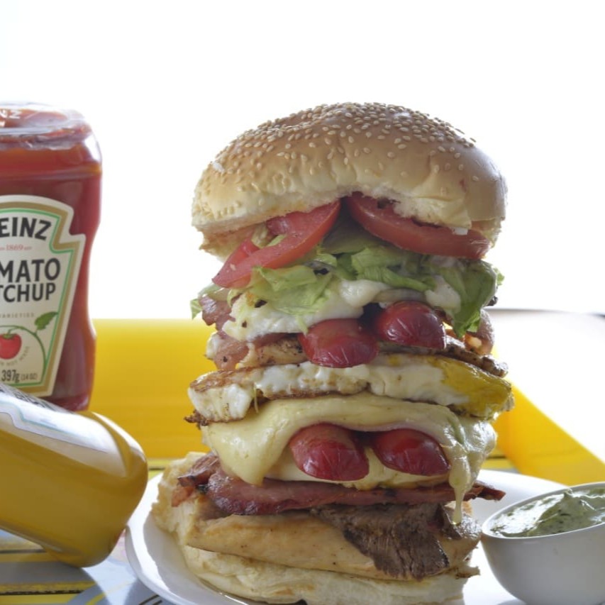 Pão, 2 hambúrgueres, 2 ovos, 2 bacons, 2 salsichas, 2 mussarelas, 2 presuntos, salada, milho e batata.