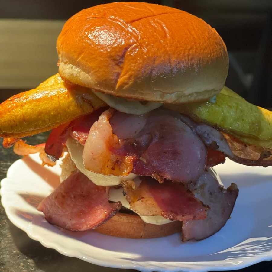 Pão brioche,2 hambúrguers de 150 gr cada,queijo mussarela,farofa de bacon,banana frita,molho caseira