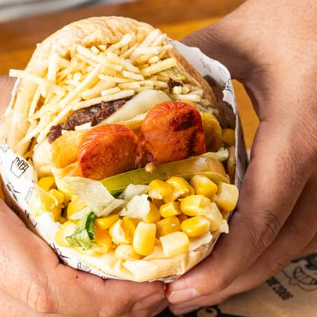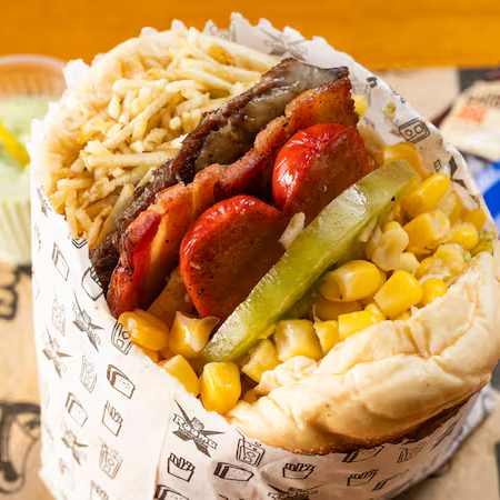 Pão macio, carne suculenta, frango, lombo, presunto e mussarela derretidos, ovo, salsicha e bacon crocante, alface fresca, tomate, milho e batata palha, formando um lanche completo, reforçado e cheio de sabor.
