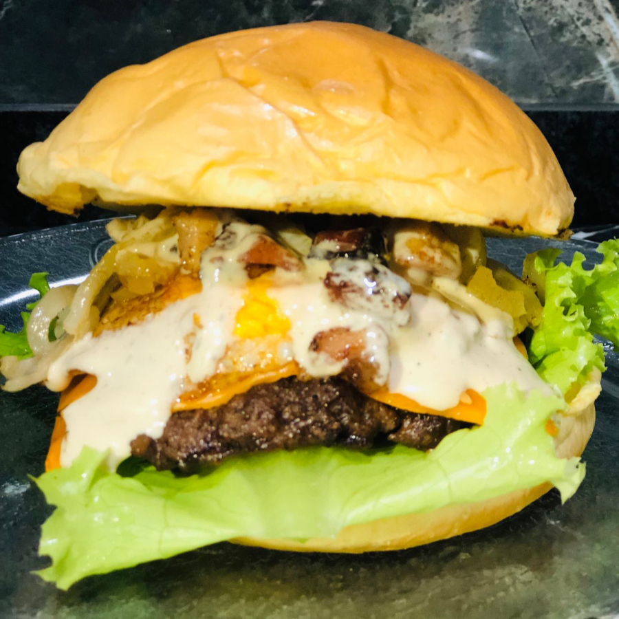 Pão brioche macio, hambúrguer artesanal de 150g suculento, cheddar derretido, bacon crocante, ovo, alface fresca, tomate, cebola e molho especial da casa, formando um lanche completo, bem servido e cheio de sabor.