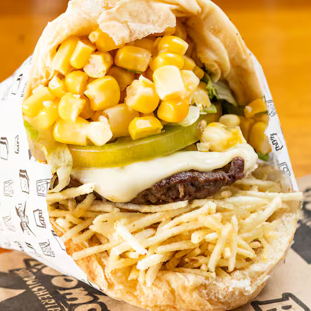 Pão macio, carne suculenta grelhada, presunto e mussarela derretidos ,ovo, alface fresca, tomate, milho e batata palha crocante, formando um lanche completo, equilibrado e cheio de sabor.
