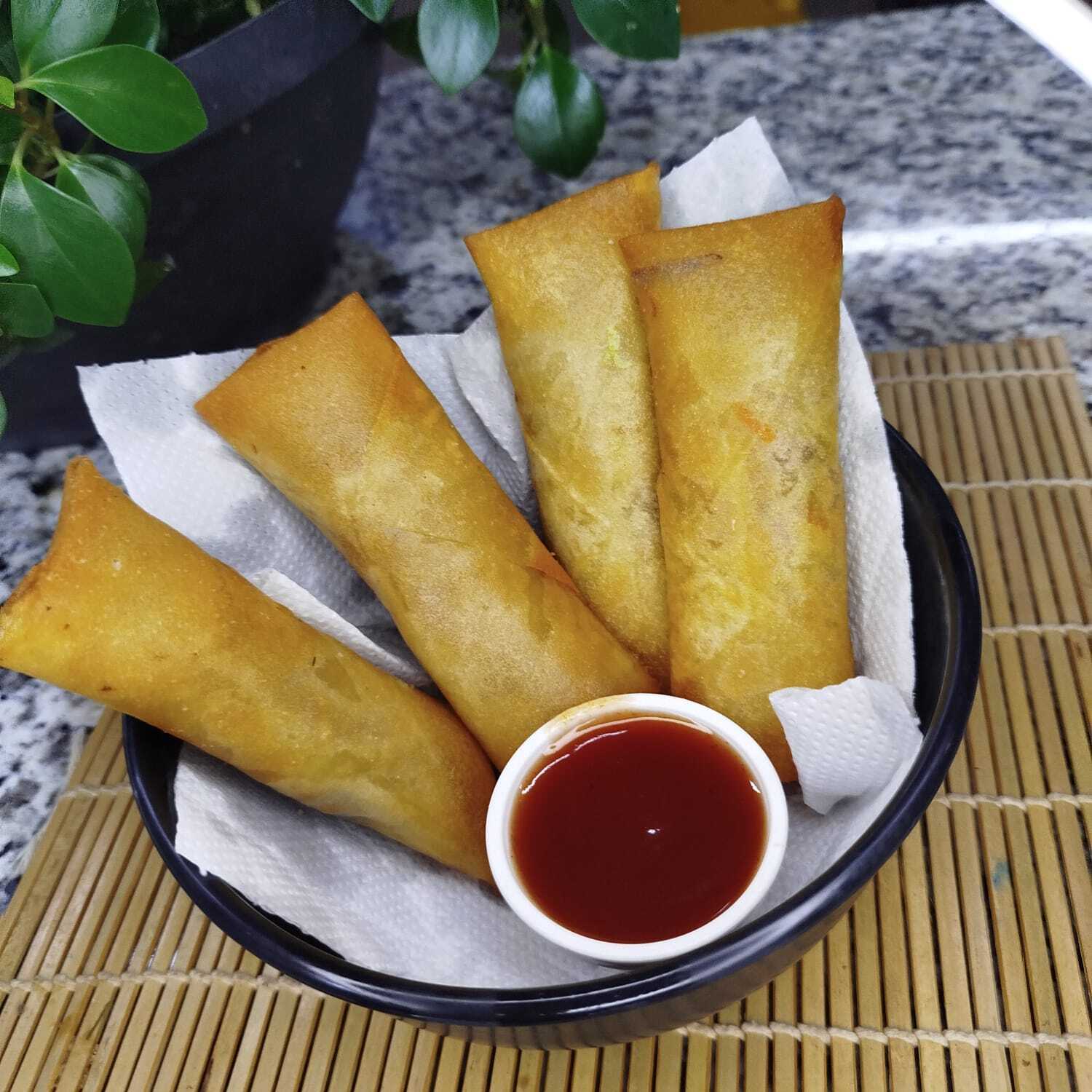 (NÃO ACOMPANHA MOLHOS) - Dois rolinhos crocantes recheados com legumes frescos (repolho verde, repolho roxo, pimentão, cenoura) e temperados com óleo de gergelim. Leve e saboroso!